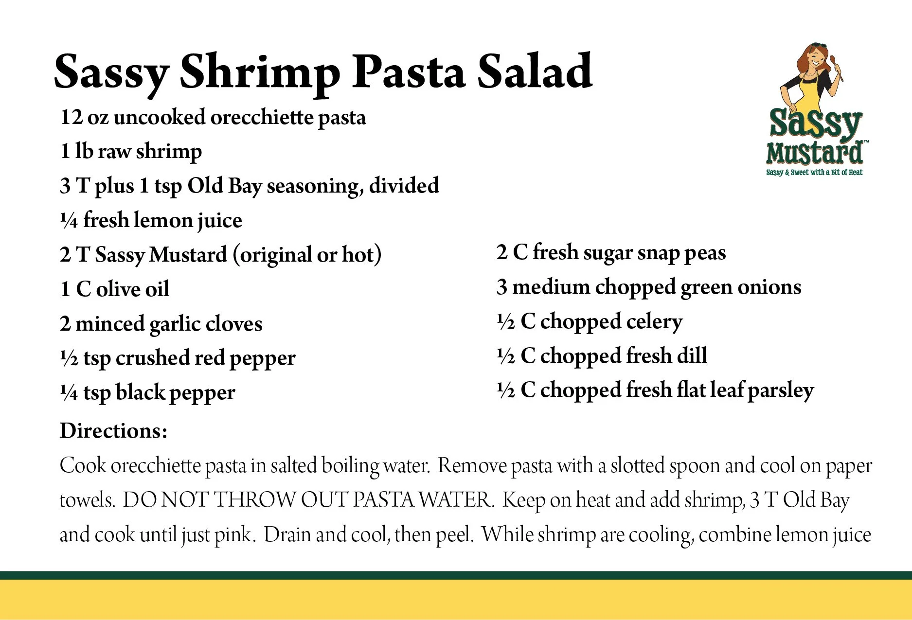 Directions: Cook orecchiette pasta in salted boiling water. Remove pasta with a slotted spoon and cool on paper towels. DO NOT THROW OUT PASTA WATER. Keep on heat and add shrimp, 3 T Old Bay and cook until just pink. Drain and cool, then peel. While shrimp are cooling, combine lemon juice and Sassy Mustard. Then whisk in the olive oil until smooth. Then whisk in garlic, crushed red pepper, black pepper, and 1 tsp Old Bay seasoning. Finally combine all ingredients and toss until well-coated. Store in refrigerator for at least 24 hours until serving to meld flavors.